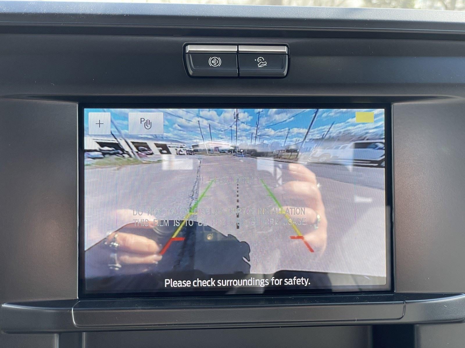 - The vehicle is equipped with a camera that displays an image of the area behind the vehicle on an interior display.