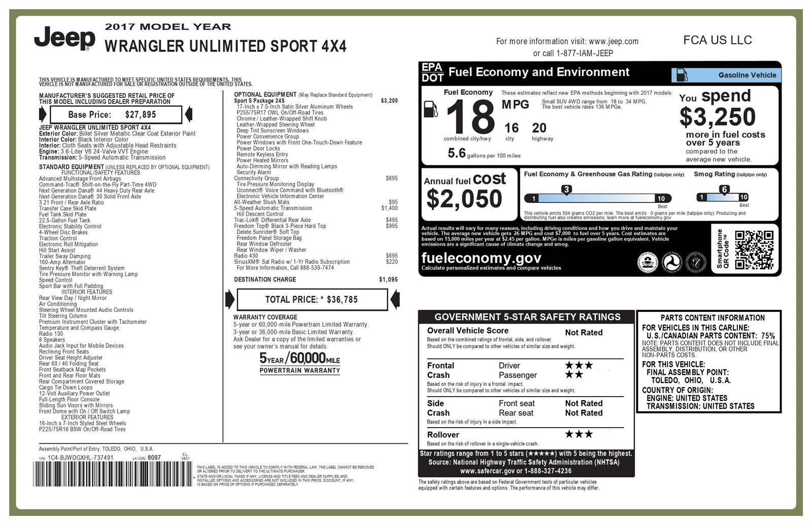 **SPORT S PACKAGE 24S** ($3,200 ADD TO MSRP), **5-SPEED AUTOMATIC TRANSMISSION** ($1,400 ADD TO MSRP), FREEDOM TOP BLACK 3-PIECE HARD TOP, RADIO 430, CONNECTIVITY GROUP, TRAC-LOK DIFFERENTIAL REAR AXLE, 3.6L V6, 5-SPEED AUTOMATIC TRANSMISSION, 4WD, KEYLESS ENTRY, PUSH BUTTON START, REMOTE START, UCONNECT, Bluetooth® FOR HANDS-FREE PHONE, POWER HEATED MIRRORS, ELECTRONIC STABILITY CONTROL, TRACTION CONTROL, ELECTRONIC ROLL MITIGATION, HILL START ASSIST, TRAILER SWAY DAMPING, SENTRY KEY THEFT DETERRENT SYSTEM, HILL DESCENT CONTROL